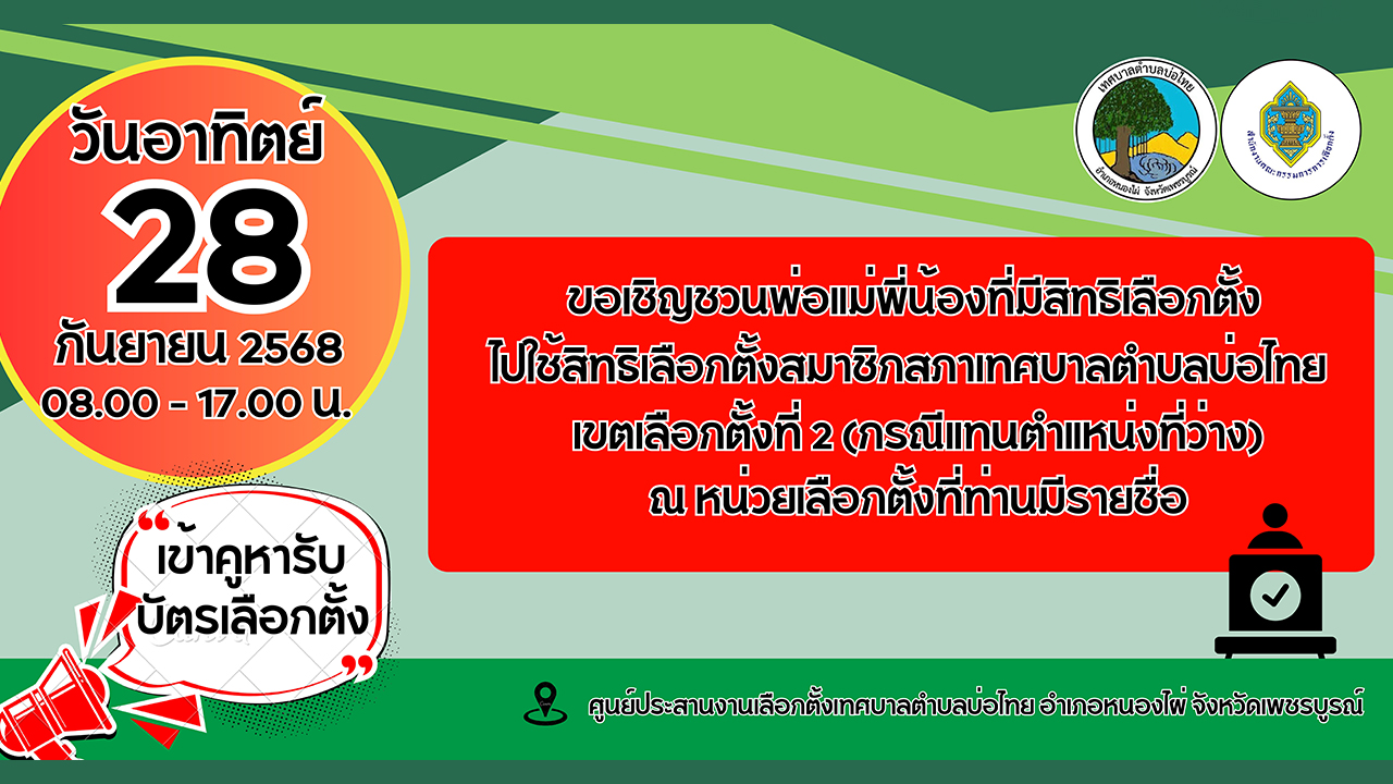ประกาศผู้อำนวยการการเลือกตั้งประจำเทศบาลตำบลบ่อไทย เรื่อง ให้มีการเลือกตั้งสมาชิกสภาเทศบาลตำบลบ่อไทย...