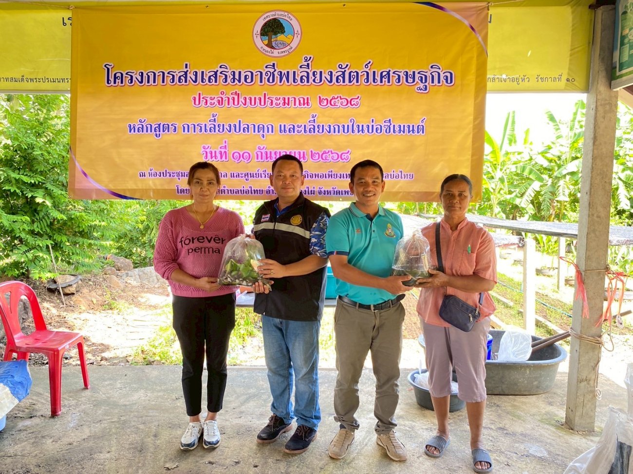 วันที่ 11 กันยายน 2568 กองสวัสดิการสังคมเทศบาลตำบลบ่อไทยจัดโครงการส่งเสริมอาชีพเลี้ยงสัตว์เศรษฐกิจ ประจำปีงบประมาณ 2568 หลักสูตรการเลี้ยงปลาดุก และกบในบ่อซีเมนต์ โดยนายศิลา สินชัย นายกเทศบาลตำบลบ่อไทย เป็นประธานเปิดโครงการ นายรุ่งโรจน์ ไตรสูงเนิน หัวหน้าสำนักปลัด รักษาราชการแทนปลัด กล่าวรายงาน พร้อมด้วยคณะผู้บริหาร สมาชิกสภาและหัวหน้าส่วนราชการเข้าร่วมโครงการ โครงการดังกลาวมีผู้เข้าร่วมอบรม จำนวน 35 คน