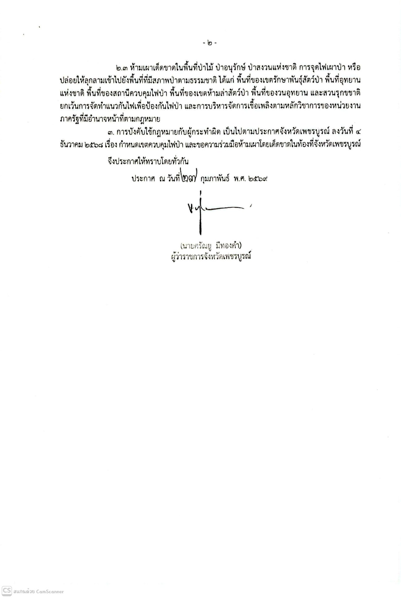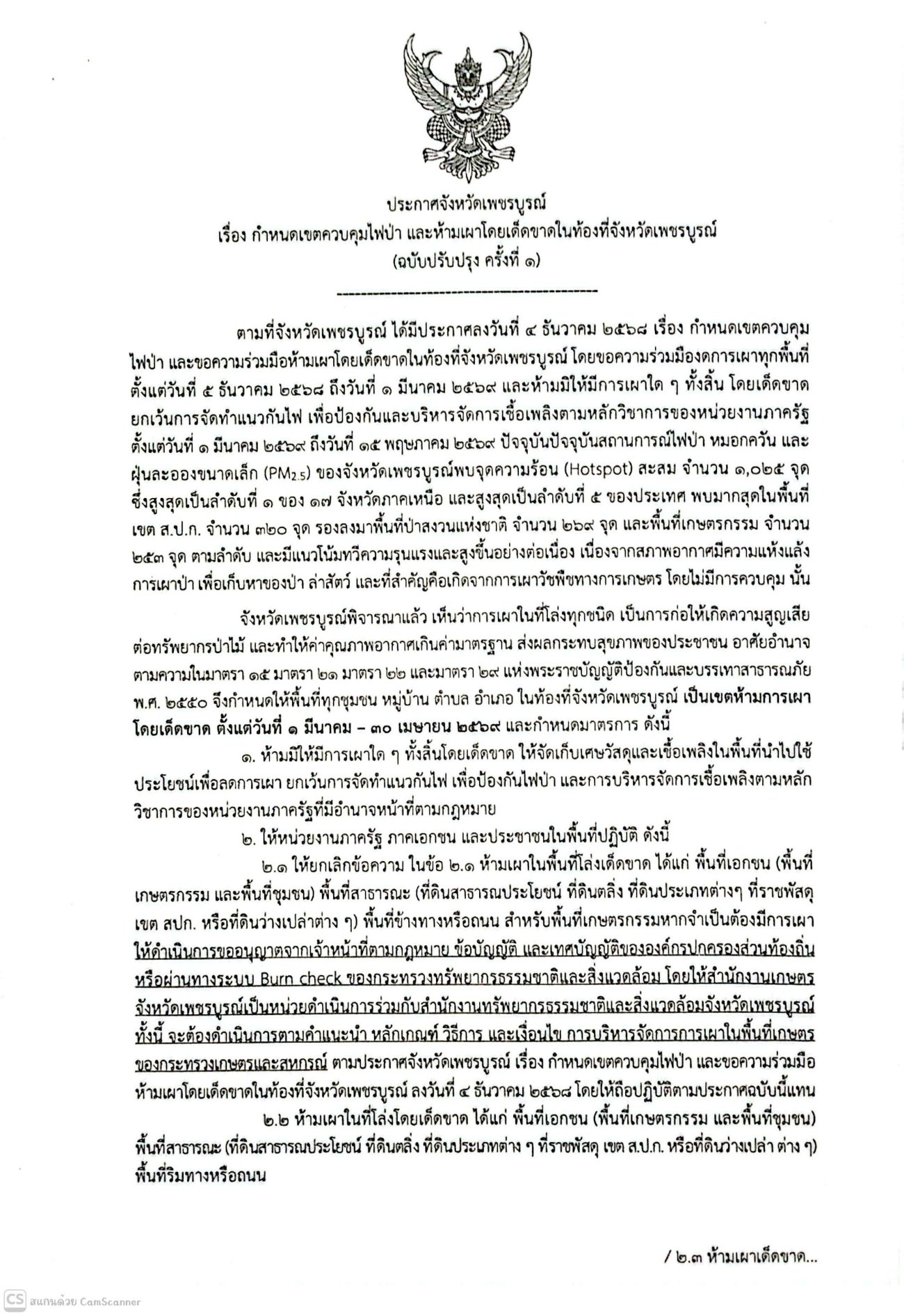 กำหนดเขตควบคุมไฟป่าและห้ามเผาโดยเด็ดขาตในพื้นที่จังหวัดเพชรบูรณ์